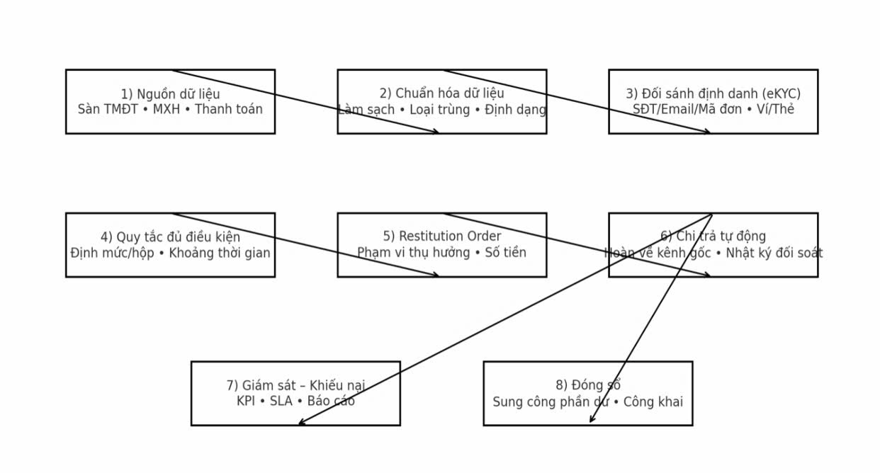 Khi đã có IRO, câu hỏi tiếp theo là làm sao chi trả cho hàng chục nghìn người một cách nhanh chóng, chính xác, tránh gian lận. Đây là lúc cần đến tầng hỗ trợ công nghệ – cơ chế “match & pay”. Ý tưởng chính của match & pay là sử dụng dữ liệu giao dịch điện tử để đối sánh danh sách người bị hại và thực hiện hoàn tiền tự động cho họ. Trong vụ CER, các giao dịch mua kẹo Kera chủ yếu diễn ra qua sàn thương mại điện tử (Shopee, TikTok Shop) và qua ví điện tử hoặc ngân hàng. Cơ quan thi hành án có thể phối hợp với các sàn và cổng thanh toán này để truy xuất dữ liệu đơn hàng cùng thông tin tài khoản của 56.385 người mua (thực tế cơ quan điều tra đã thu thập được dữ liệu này làm chứng cứ hình sự). Sau đó, cơ quan chức năng vận hành một hệ thống đối chiếu: lọc và làm sạch danh sách (loại bỏ trùng lặp, sai lệch), đối sánh định danh người nhận tiền (kết hợp phương pháp xác định chắc chắn và xác suất dựa trên tên, số điện thoại, địa chỉ, số tài khoản…), rồi tự động chuyển khoản số tiền bồi thường tương ứng đến chính tài khoản/ví điện tử mà nạn nhân đã dùng để mua hàng. Nạn nhân sẽ nhận được thông báo về khoản tiền được hoàn trả vào tài khoản (hoặc ví) của mình. Toàn bộ quá trình này có thể được thực hiện trực tuyến, hạn chế tối đa sự tham gia của con người để vừa tiết kiệm chi phí, vừa giảm nguy cơ nhũng nhiễu, sai sót. Hệ thống kỹ thuật sẽ ghi lại nhật ký giao dịch bất biến phục vụ kiểm toán, đồng thời xây dựng cổng thông tin để người dân tra cứu và khiếu nại nếu có sai sót. Với nguồn dữ liệu số hiện nay, việc “match & pay” như trên hoàn toàn khả thi, biến một quy trình pháp lý tưởng chừng phức tạp thành bài toán kỹ thuật có thể giải quyết.