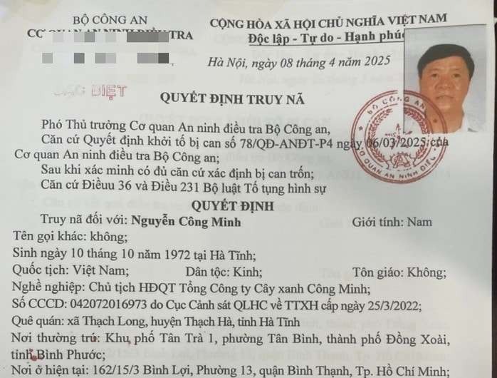 Căn cứ kết quả điều tra, Cơ quan ANĐT BCA đề nghị truy tố vắng mặt đối với bị can: Nguyễn Công Minh (Sinh ngày 10/10/1972 tại Hà Tĩnh; Nghề nghiệp: Chủ tịch Hội đồng quản trị Tổng Công ty Cây xanh Công Minh; Số căn cước: 042072016973 do Cục Cảnh sát quản lý hành chính về trật tự xã hội - Bộ Công an cấp ngày 25/3/2022; Nơi thường trú: Khu phố Tân Trà 1, phường Tân Bình, thành phố Đồng Xoài, tỉnh Bình Phước (nay thuộc phường Bình Phước, tỉnh Đồng Nai)).