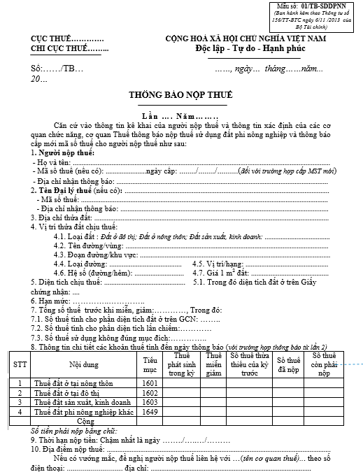 Mẫu tờ khai thuế sử dụng đất phi nông nghiệp số 01/TK-SDDPNN được ban hành kèm theo Thông tư số 156/TT-BTC ngày 6/11/2013 của Bộ Tài chính dùng cho hộ gia đình, cá nhân. Dưới đây là nội dung cụ thể của tờ khai: