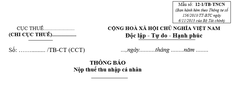 Ghi chú: Trường hợp cá nhân được miễn giảm thuế theo Hiệp định tránh đánh thuế hai lần thì cơ quan thuế không phải ra thông báo này.