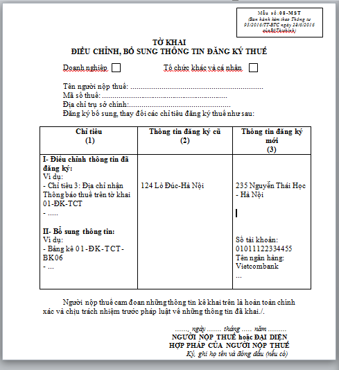 Bài viết này Luật Sao Việt xin cung cấp mẫu tờ khai điều chỉnh bổ sung thông tin đăng ký thuế theo mẫu 08-MST ban hành theo thông tư 95/2016/TT-BTC mới nhất để quý khách hàng tham khảo.