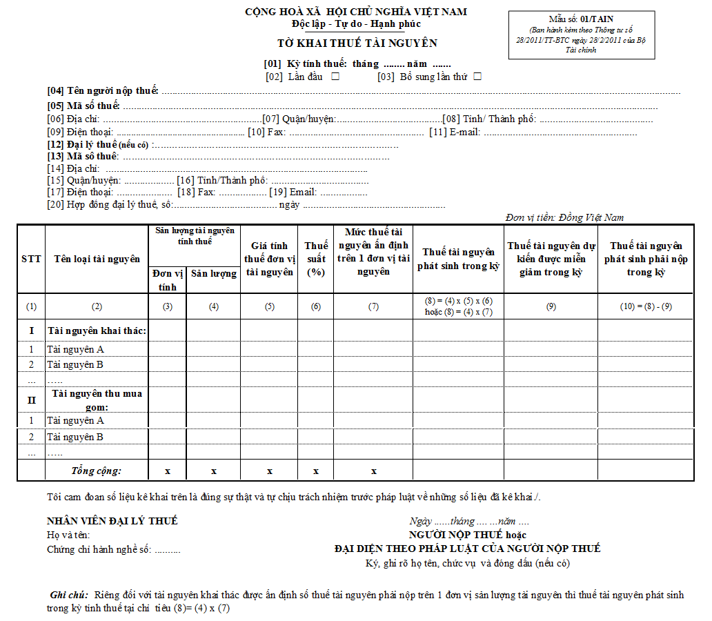 >>> Tờ khai quyết toán thuế tài nguyên - mẫu số 02/TAIN