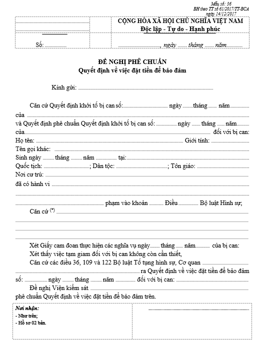 Mẫu số 03 (dùng cho bị can/bị cáo là người trên 18 tuổi) (Ban hành kèm theo Thông tư liên tịch số 06/2018/TTLT-BCA- ...
