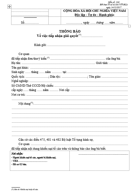 Mẫu thông báo về việc tiếp nhận giải quyết khiếu nại, tố cáo là mẫu thông báo được lập ra để thông báo về việc tiếp nhận giải quyết khiếu nại, tố cáo, được ban hành theo Thông tư 61/2017/TT-BCA của Bộ Công an. Mời bạn đọc cùng tham khảo chi tiết và tải về mẫu thông báo tại đây: