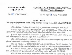 (THPL) - UBND thị xã Sa Pa xử phạt ông N.T.H - nhân viên Trung tâm Bồi dưỡng chính trị thị xã Sa Pa vì trốn khai báo y tế khi trở về từ vùng dịch.