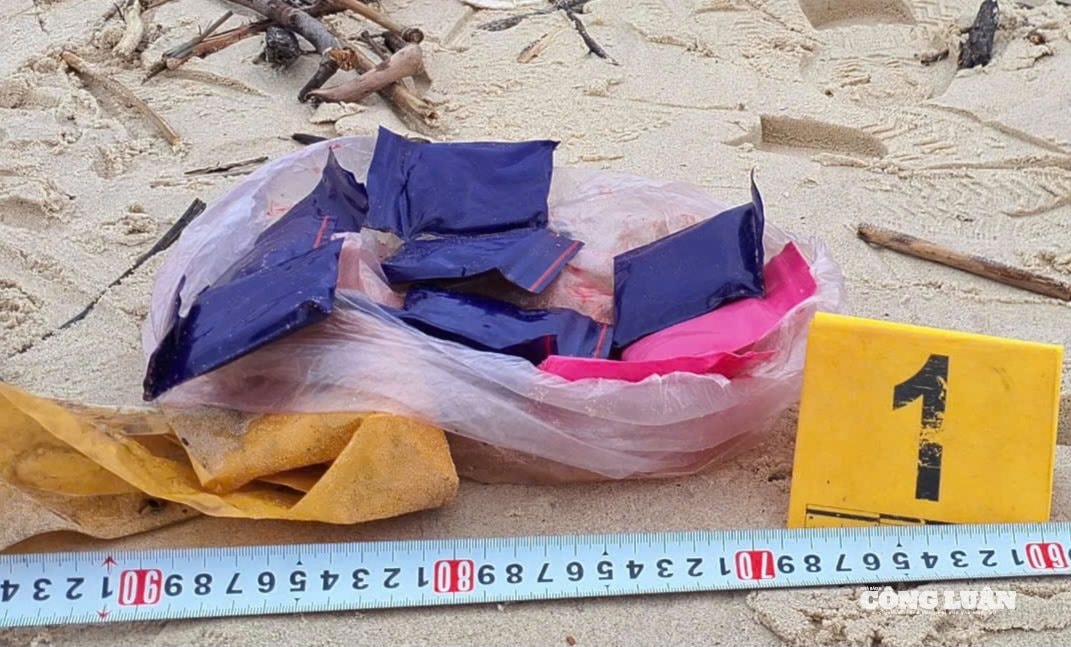Bên trong các túi nilon nhỏ chứa nhiều viên nén màu hồng, nghi là ma túy tổng hợp. Số viên nén đã bị ướt, mềm nhũn và trộn lẫn với nhau, đồng thời lẫn với cát biển nên không thể kiểm đếm chính xác. Tổng khối lượng số tang vật khoảng 300g (tính cả bao bì và cát biển).